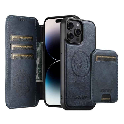 For iPhone 14 Pro Max Suteni Q05S2 3-in-1 Detachable Vertical Flip Wallet MagSafe Leather Phone Case(Blue)