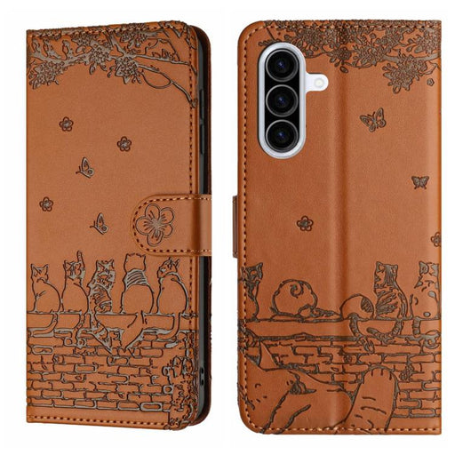 For Samsung Galaxy A36 5G Cat Embossing Pattern Leather Phone Case with Lanyard(Brown)