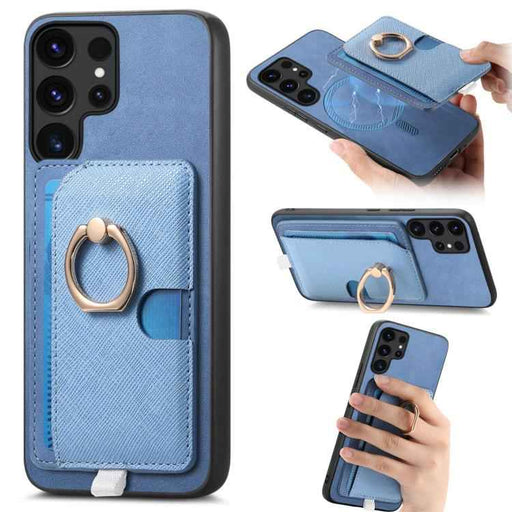 For Samsung Galaxy S24 Ultra 5G Retro Cross Leather Ring Side Insert Card Bag MagSafe Phone Case(Blue)
